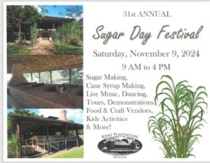 The 31st Annual Kent House Sugar Day Festival is scheduled for Saturday, November 9, 2024, from 9 AM to 4 PM. Sugar Day is a family friendly festival that celebrates the harvest of sugar cane by making cane syrup in our very own sugar mill. There will be live music, dancing, house tours, and plenty of children’s activities including petting zoo and face painting! There will be a variety of food and craft vendors. Demonstrations of blacksmithing, corn grinding, wood carving, fly fishing and more will be included.