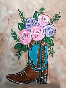 Join us for a fun painting session where we will be creating a beautiful western boot and bouquet masterpiece! The event includes a choice of an 11 x 14 canvas or a 14″ wood door hanger (with an additional $5 fee), all the necessary supplies, step-by-step instruction, 2 alcoholic or non-alcoholic drinks, and door prizes. It’s the perfect opportunity to unleash your creativity, socialize with others, and take home a work of art that you can be proud of. Don’t miss out on this delightful painting experience!