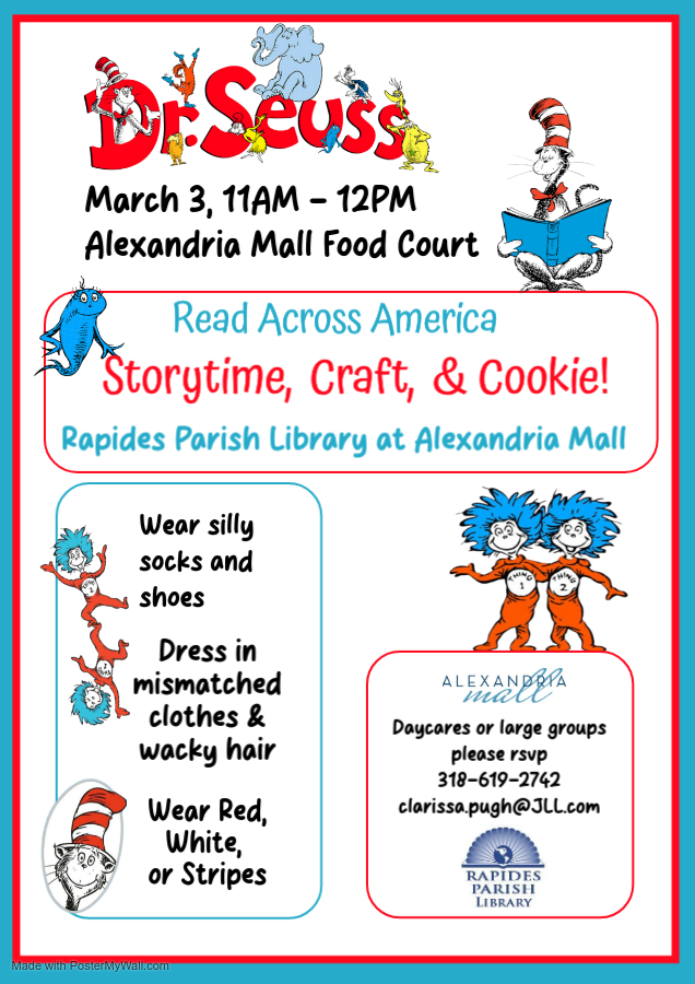 Dr. Seuss Read Across America Storytime, Craft, and Cookie. While supplies last. Daycares or large groups RSVP to Clarissa at 318-619-2742 or clarissa.pugh@JLL.com