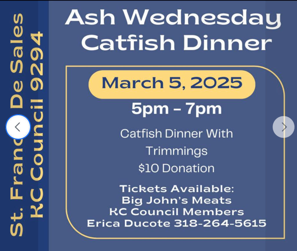Ash Wednesday Catfish Dinner March 5, 2025 5pm – 7pm Catfish Dinner With Trimmings $10 Donation Tickets Available: Big John’s Meats KC Council Members At The Door