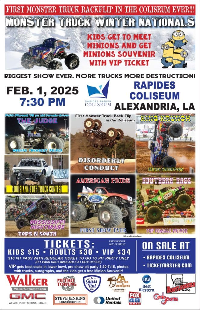 Cenla, get ready! Do not miss the return of the Monster Truck Winter Nationals on Saturday, February 1 at 7:30 PM! The world’s youngest driver, 16 year old Faith Phreed, is back with a new truck called “The Judge”! First Monster Truck backflip in the Coliseum! Louisiana Tuff Trucks, Minions for the kids, Monster Truck […]