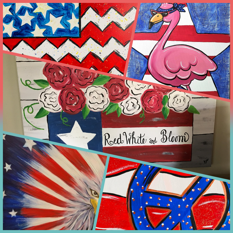 Get ready to show off your red, white, and YOU at our Patriotic Painter’s Choice Paint Party! 🎨 Pick your favorite design: Chevron Flag Peace Flag Fla’American (flamingo fun!) Red, White & Blue Eagle Red, White & Bloom Paint your masterpiece on an 11×14 canvas for $43 or upgrade to a 14″ wood door hanger