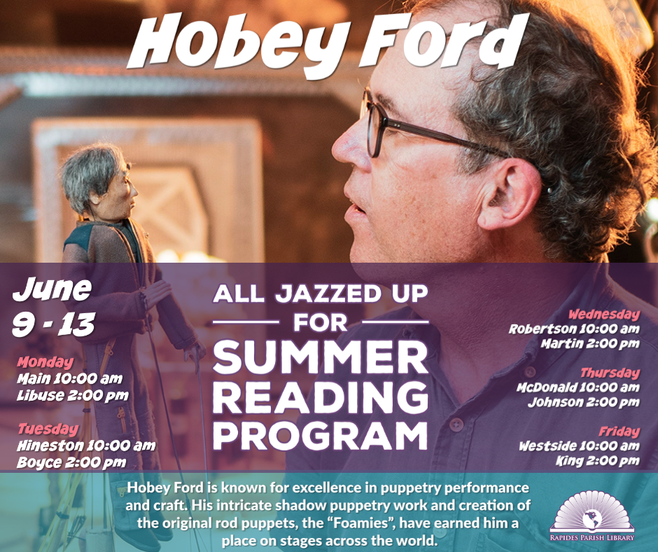 10:00AM – 11:00AM & 2:00PM – 3:00PM Watch Hobey Ford show all about various animals through his masterful puppetry skills! You want to be sure to not miss this amazing experience! Hobey will be visiting all ten branches the week of June 9-13! 10:00AM – 11:00AM & 2:00PM – 3:00PM Hobey Ford is known for […]