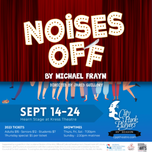 City Park Players is thrilled to bring Noises Off, by Michael Frayn, to Hearn Stage this year. Directed by Jared Guillory, Noises Off opens September 14 and features: Jill Dupont, Brayden Smith, Mark Weinzettle, Jacob Parker, Madeline Grant, Halli Watson, Steven Byone, Mia Huffman, and Nick Blackstone.