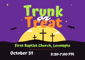 Enjoy a good time of fun, fellowship, costumes and tons of candy at our annual Trunk-or Treat event on October 31st, from 5:30-7:00 PM.  Located in the parking lot at First Baptist Church Lecompte.