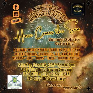 Join us during Magick ‘n Moonlight’s Mystique Bazaar for Here Comes the Sun, Summer Solstice Gathering, featuring our enchanting magical wares, energy workers, and a community ritual. โ˜€๏ธ