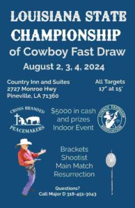 The Louisiana State Championship of Cowboy Fast Draw will be held August 2, 3, 4, 2024 at Country Inn and Suites, Pineville LA. We expect shooters from 10 states. We will once again be bringing the exciting sport of Cowboy Fast Draw to the Pineville area.