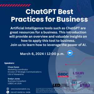 Artificial Intelligence tools such as ChatGPT are great resources for any business! This introduction will provide an overview and valuable insights on how to apply this tool to business. Join us to leverage the power of AI and learn best practices for using ChatGPT. This session will encompass: