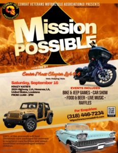 Combat Veterans Motorcycle Association®, Louisiana Chapter 6-6 (registered 501c non-profit), is holding a fundraising event to support Veterans in long-term care facilities and disadvantaged children of Veteran’s during Christmas 2023. 100% of funds raised will be split 50/50 between the two causes. Veterans in central Louisiana long-term care facilities will receive care packages and the children will each receive a new bicycle, school coat, and a present of their liking. There will be motorcycle and jeep games, a car show, food and drinks, raffles and auctions, as well as live music. Please come support a good cause. If you would like to donate items for raffle or auction, a tax-deductible form is available upon request, please email commander@cvmala6-6.com.
