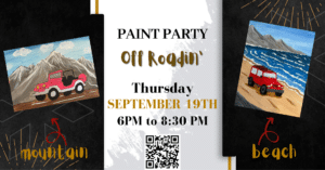 Choice of Mountain or Beach on a 11×14 canvas. Includes all supplies, step-by-step instructions and 2 beers OR 2 glasses of wine (or non-alcoholic beverage). Beginners welcome and all painters leave with a finished painting. So, gather up your friends and let’s paint together!