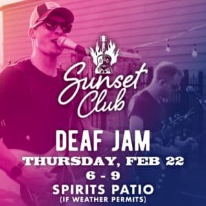 Join us for Thursday Sunset Club on the Spirits patio (if weather permits) with live music with Deaf Jam, covering 60’s through today’s hits! Soak up the good vibes and let Sunset Club take you away…..