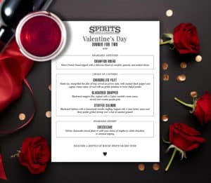 Come celebrate Valentine’s Day Spirits-style! Starting Wednesday through Saturday (4pm-9pm), enjoy a 3 course meal for 2 with: