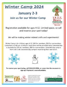 Winter Camp is for children ages 4-12. $45 for members,$50 for non members. Camp time is 9:00am-12:00pm. Extended day is available!
